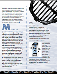 ![]() Drains and Related Structures: What You Need to Know The Drains brochure helps businesses identify where drains lead, restrictions for different types of drainage systems, maintaining the system and who's responsible. Illustrations of catch basins and oil/water separators demystify these simple but important structures. (PDF, 2.1 MB) |