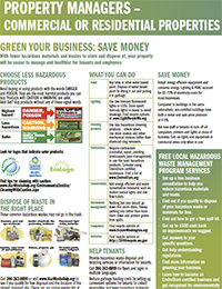 ![]() Property Managers - Commercial or Residential Properties: Green Your Business, Save Money This poster helps property managers choose safer products, dispose of waste properly, save money and help tenants. It lists free LHWMP services for businesses. (PDF, 464 KB) |