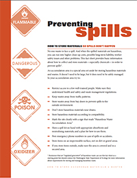 Preventing Spills: How to Store Materials so Spills Don't Happen This comprehensive guide to spill prevention addresses: setting up an accumulation area, secondary containment for tanks and containers, diagrams and examples, and routine inspections. (PDF, 410 KB) |