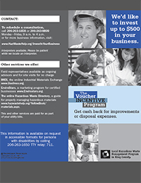 ![]() The Voucher Incentive Program We'd like to invest in your business. King County supports businesses that support the environment. Commitment to long-term change can earn your company 75% matching funds for every dollar wisely spent on hazardous materials management, up to a ceiling of $599. (PDF, 544 KB) |